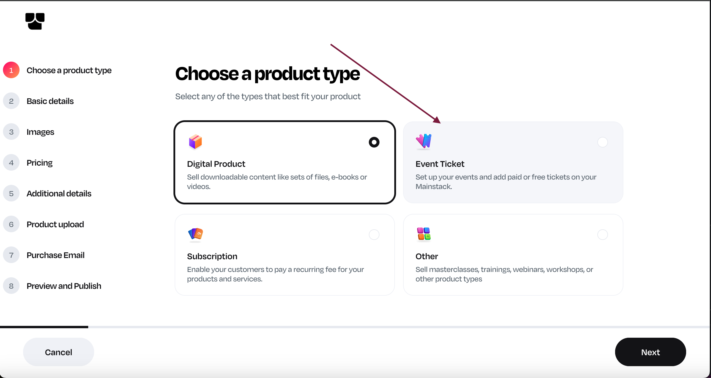 Log in to your Mainstack Dashboard. On the Home page, scroll to the Mainstack Apps section and click on Storefront. Click on the ‘+ Add product with AI’ button. Select Event Ticket as your preferred product type. Enter the basic information about the ...