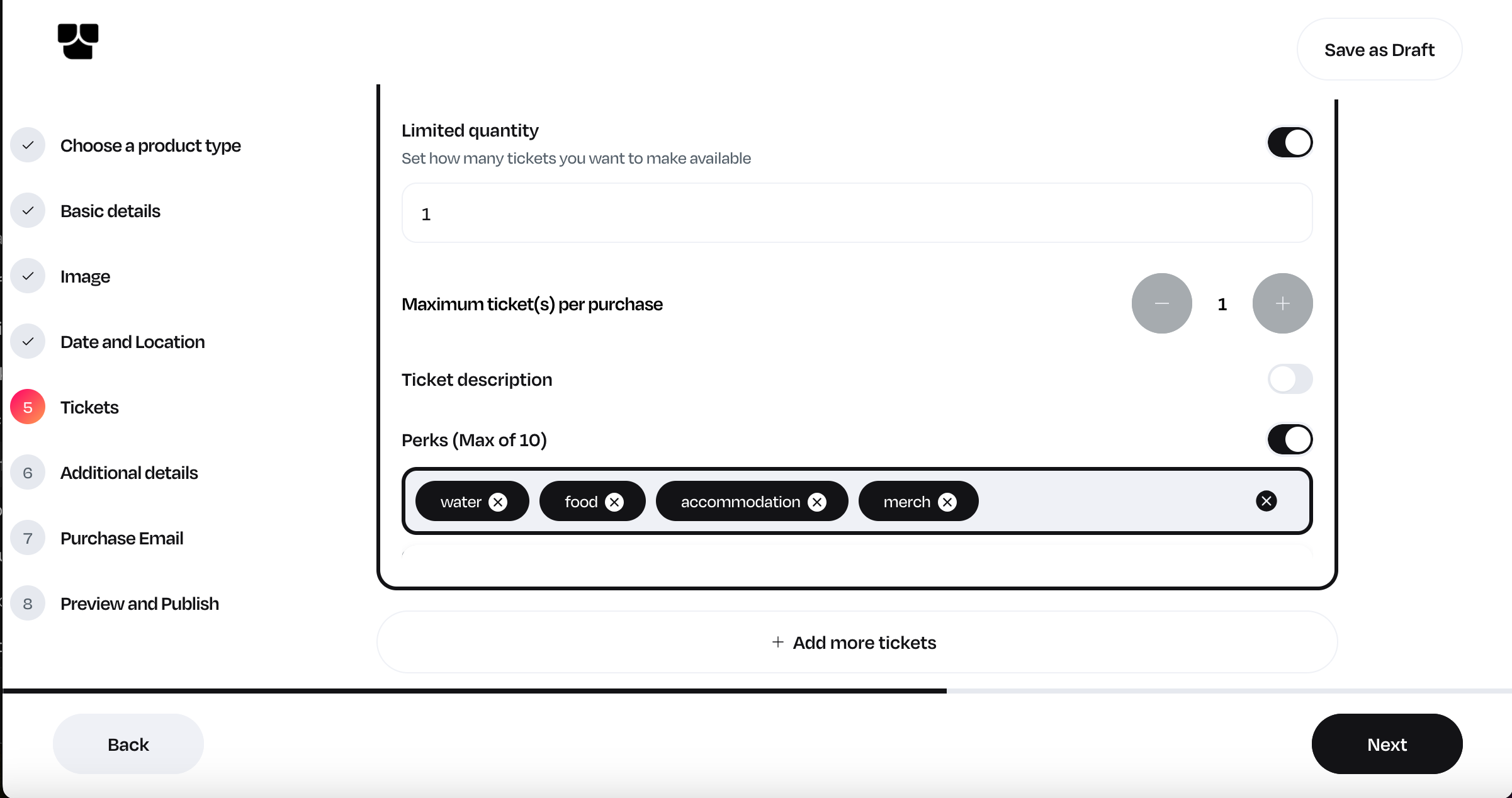 Set your ticket price, ticket type, ticket name, and quantity per purchase