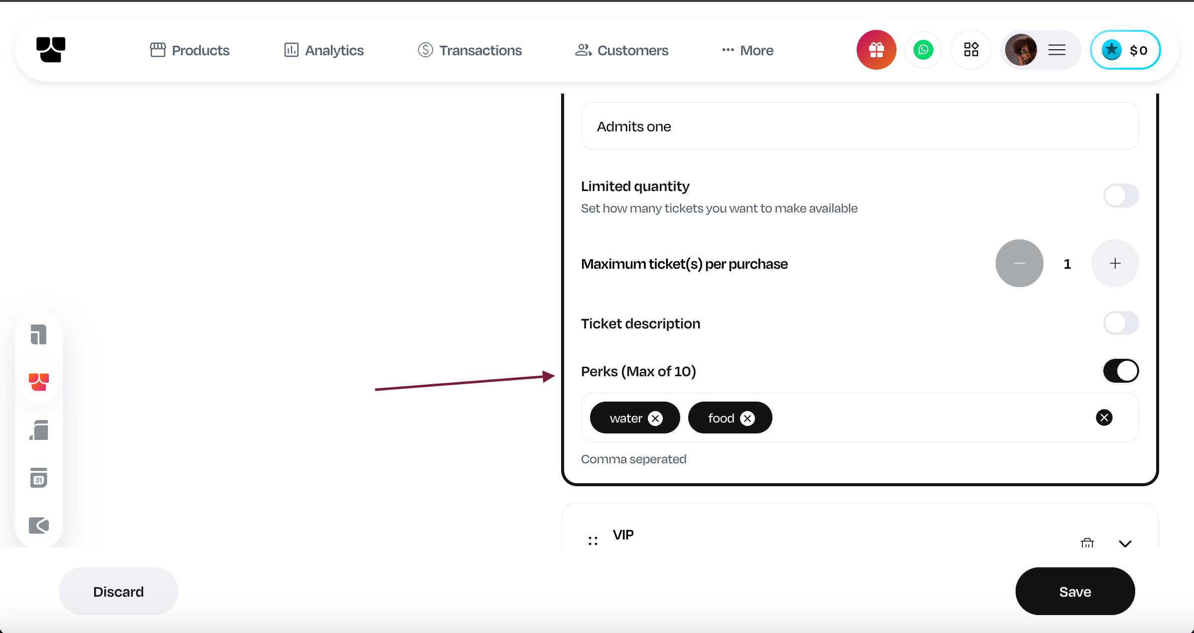 Toggle on the perks button, add as many perks as you want(up to 10), and click on Save.