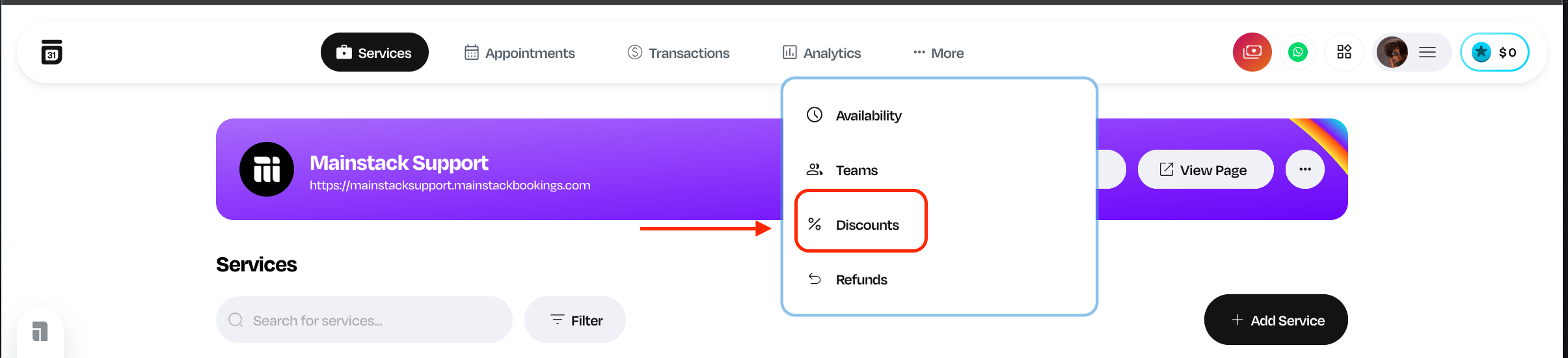 Here’s how to create a discount on your Storefront Dashboard; Log in to your Mainstack Dashboard. On the Home page, click on Storefront Click on More at the top right corner of the dashboard. Select Discounts Click on the “Create Discount” button ...