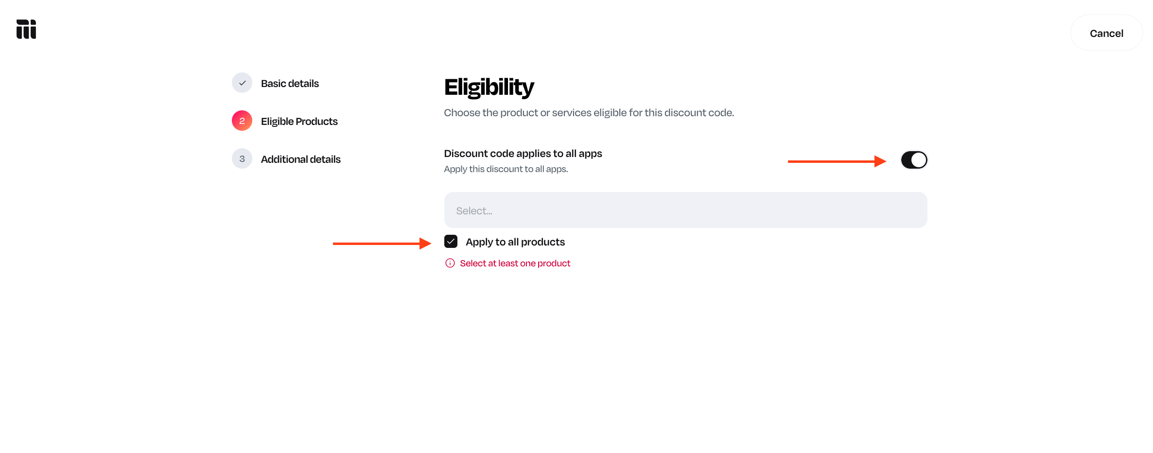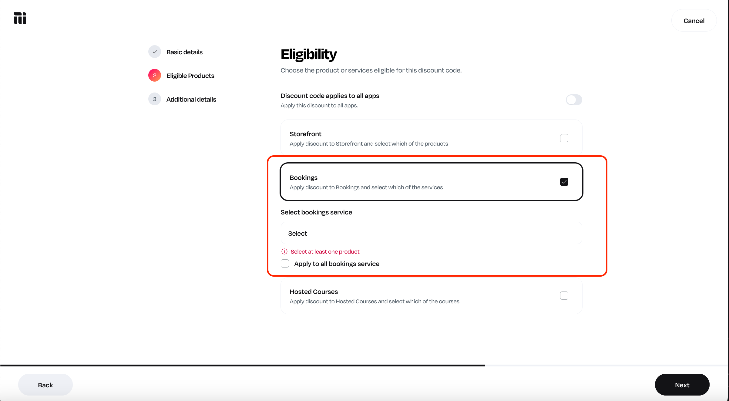 Choose All apps (Storefront, Bookings, and Courses) - if you have other types of products you want the discount to be applied to, or