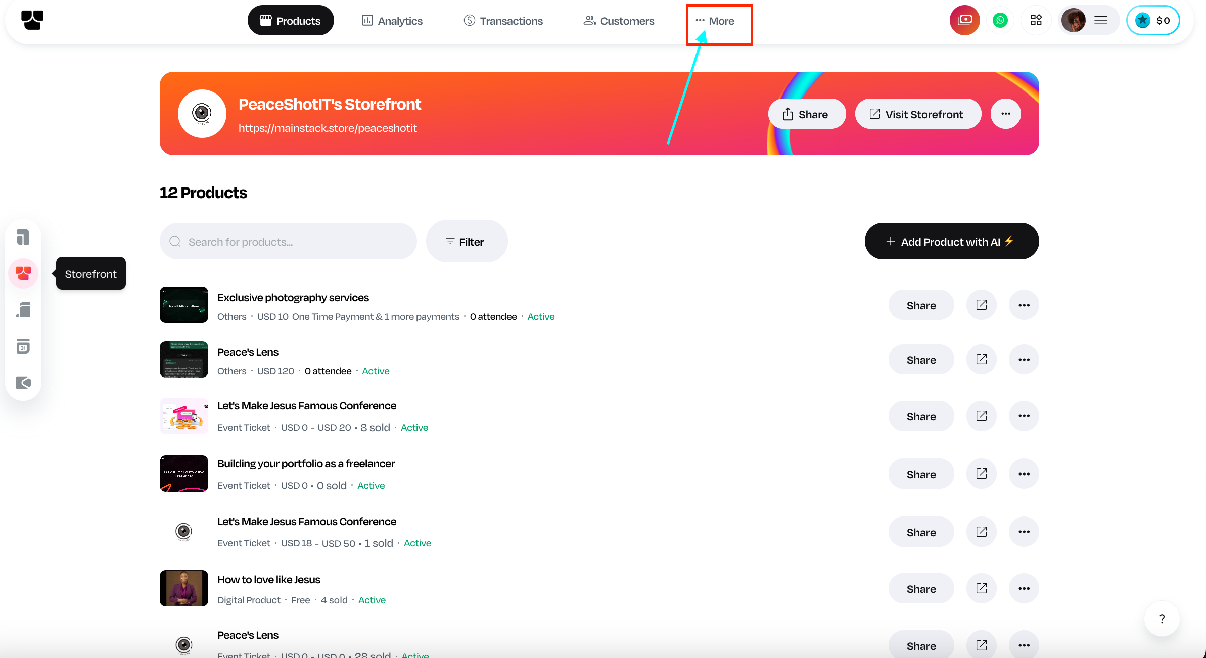 Log in to your Mainstack Dashboard. On the Home page, click on Storefront