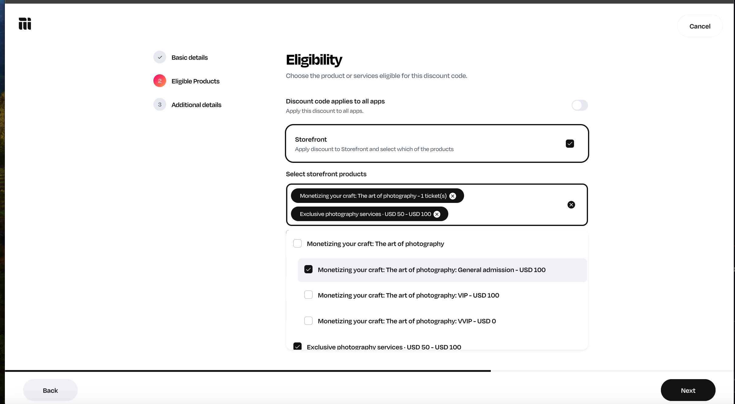Choose All apps (Storefront, Bookings, and Courses) - if you have other types of products/services you want the discount to be applied to, or