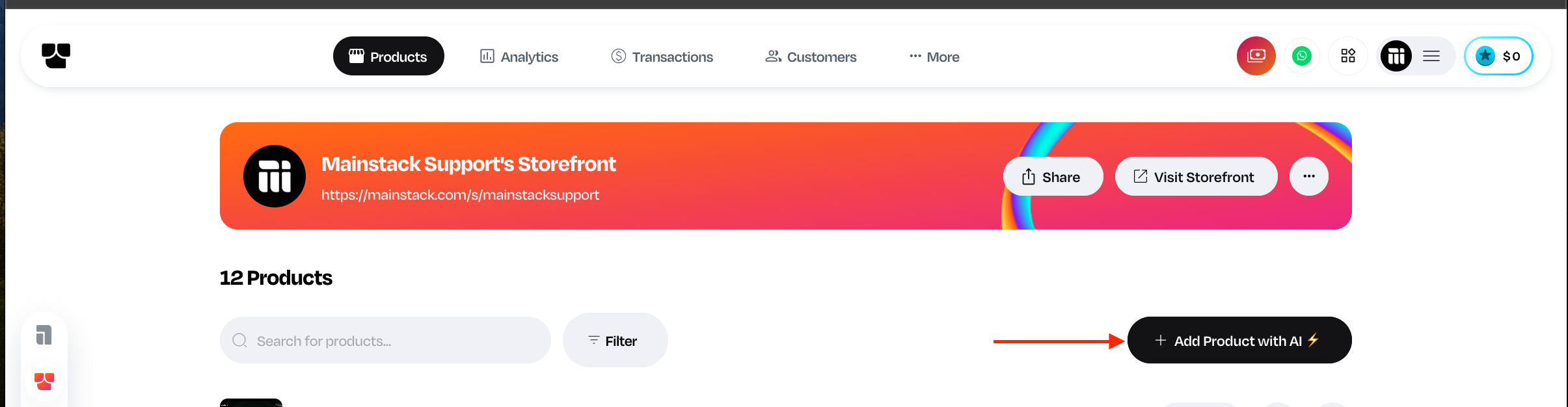 Log in to your Mainstack Dashboard. On the Home page, scroll to the Mainstack Apps section and click on Storefront.