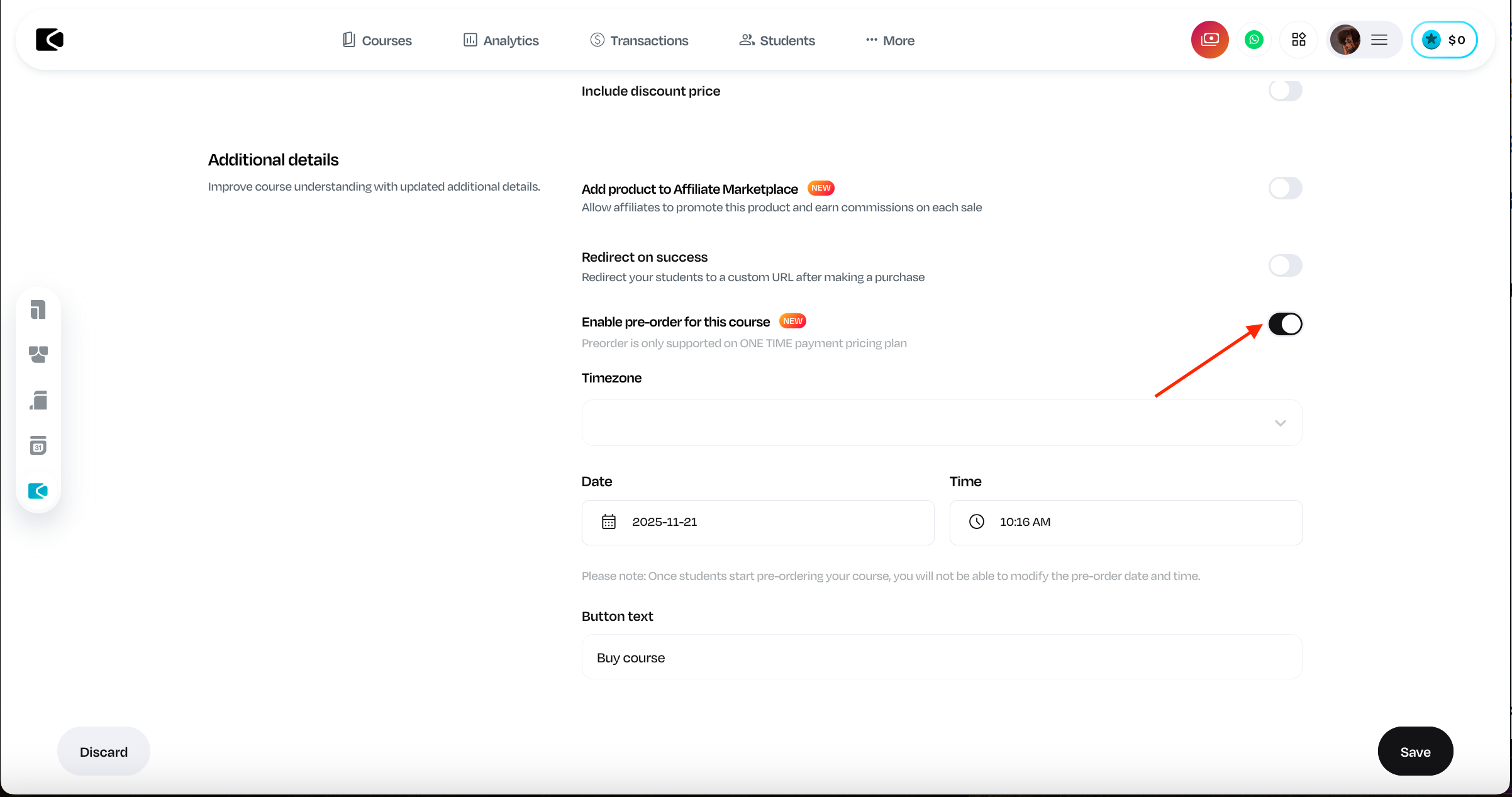 Toggle on the “Enable pre-order for this course” button.