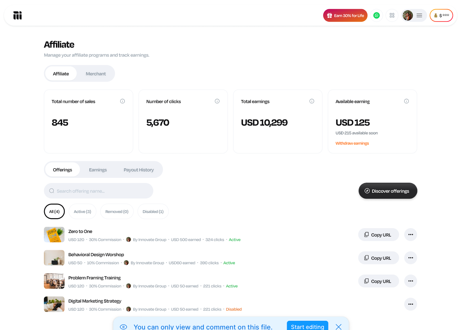 On the Offerings page, you can track all you need to know about your offerings, including the number of sales, the number of clicks, total earnings, and available earnings.