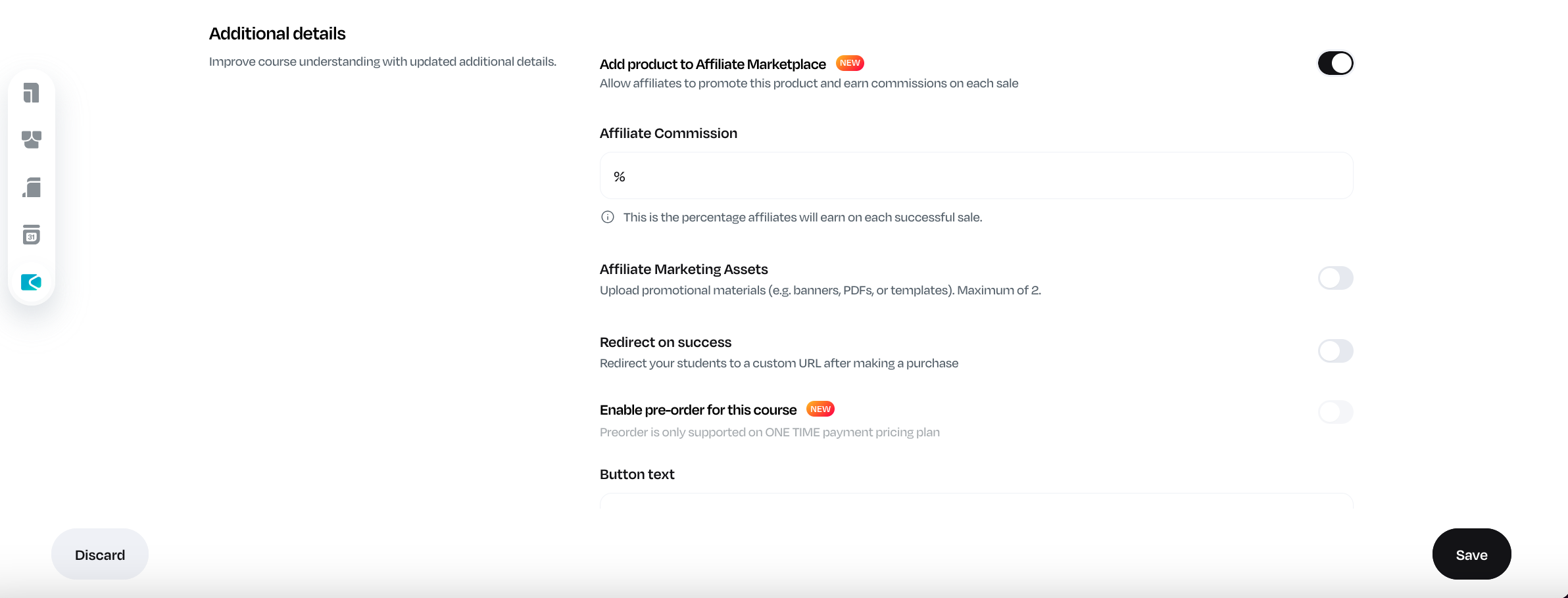 Log in to your account. On the Home page, click on Hosted Courses Click on the course you want to list. On the course details page, scroll down to the additional details section. Toggle on the “Add product to Affiliate Marketplace” button Click on ...