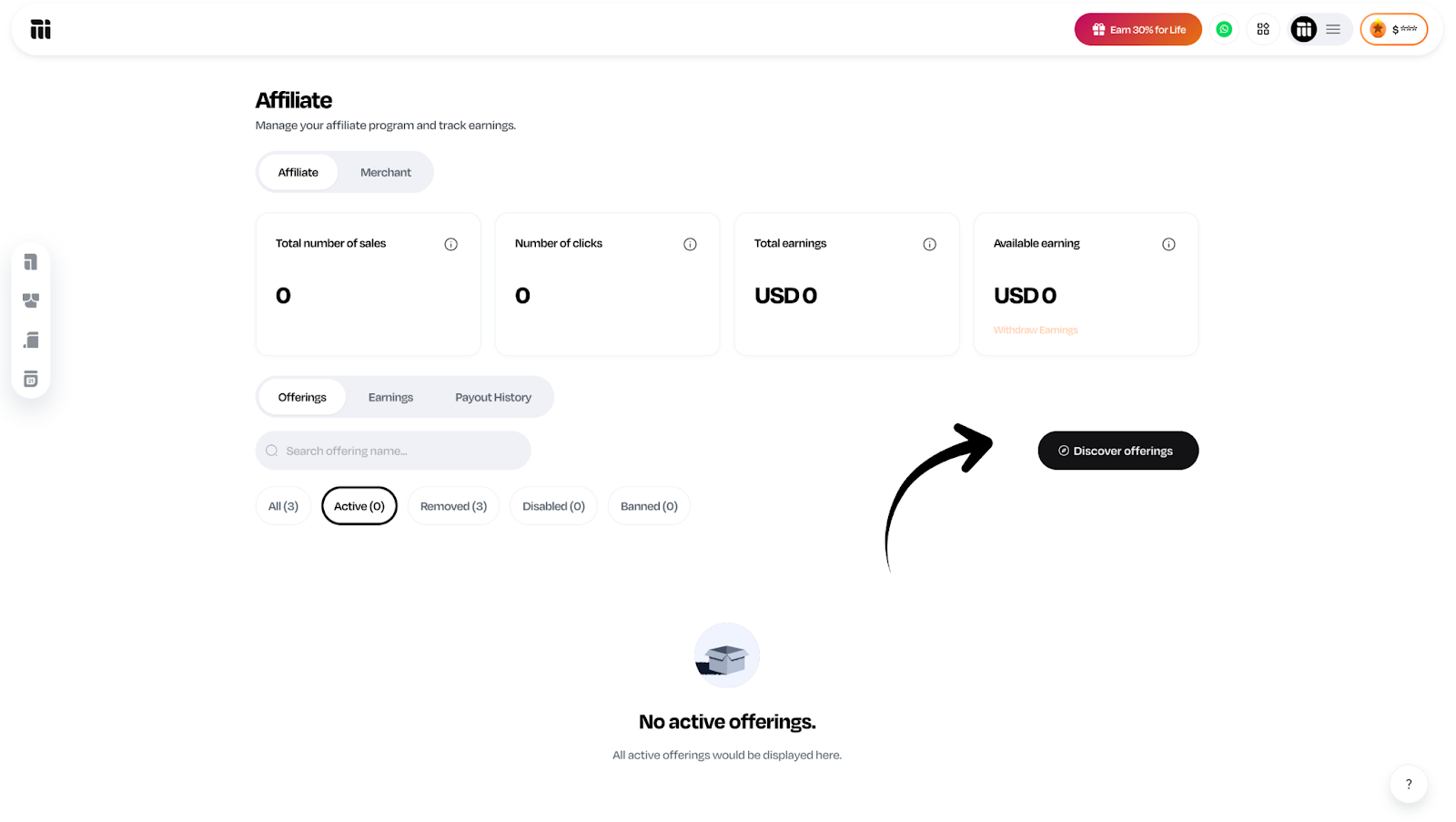 1. Log in to your account. 2. Click on your profile picture at the top right corner of your dashboard. 3. Click on Affiliate, and you will be redirected to the affiliate dashboard. 4. Click on Discover Offerings, and you will see the list of product ...