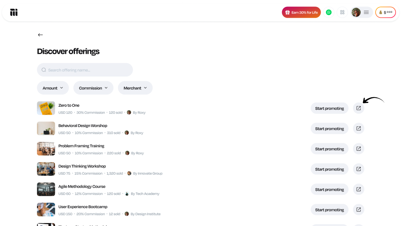 Click on "Discover Offerings," and you will see a list of product offerings available, along with their corresponding commissions.