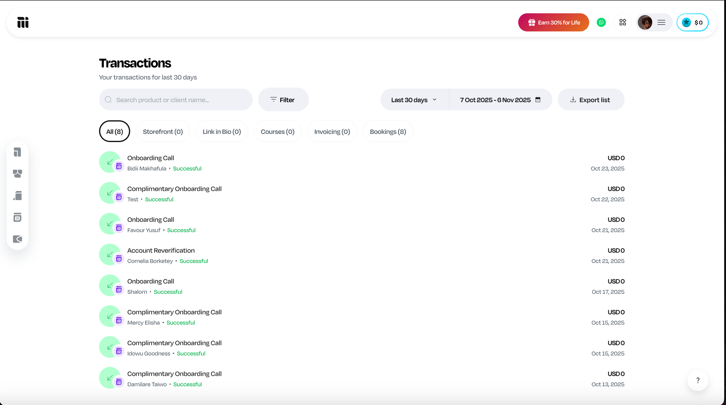 App-level transactions (e.g., from your Storefront, Hosted Courses, or Bookings sales dashboard).