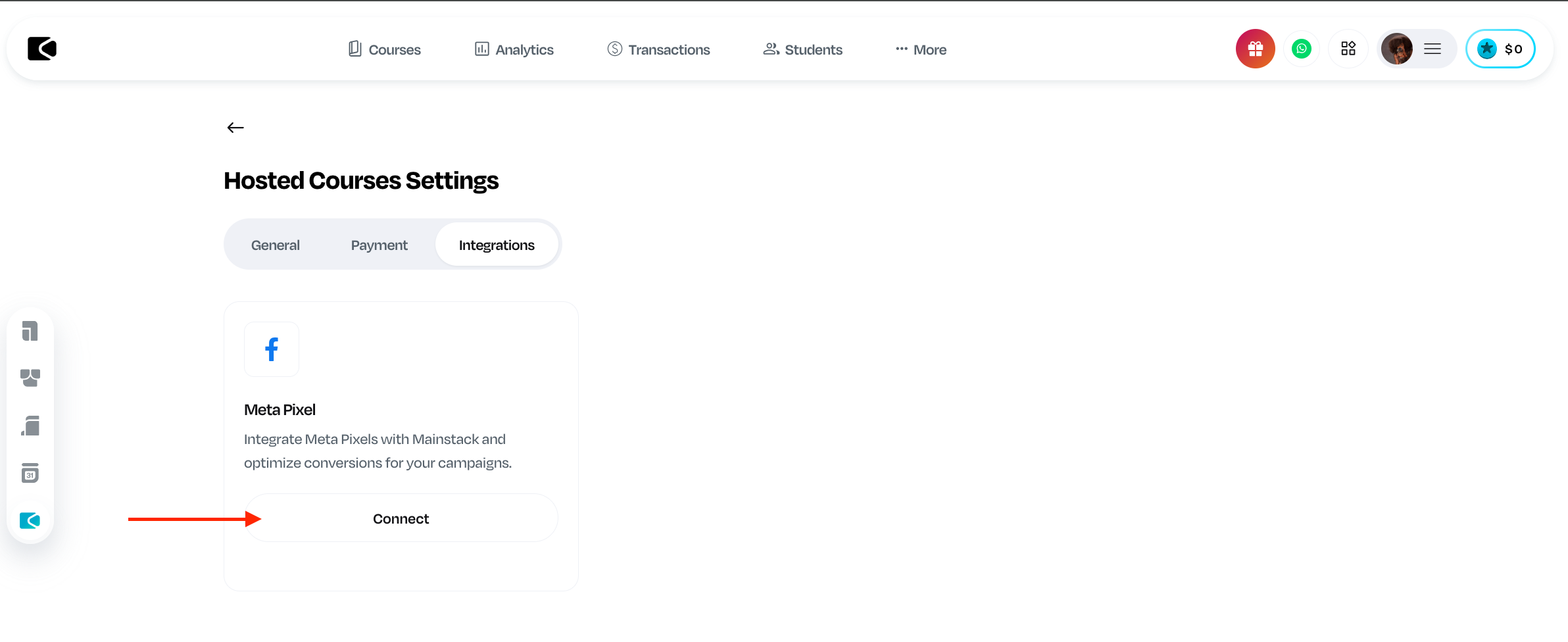 Log in to your Mainstack Dashboard. On the Home page, scroll to the Mainstack Apps section and click on Storefront. Click on the three dots on the right side of the banner cover Click on Integration On the Meta pixel tab, click on connect Enter your ...