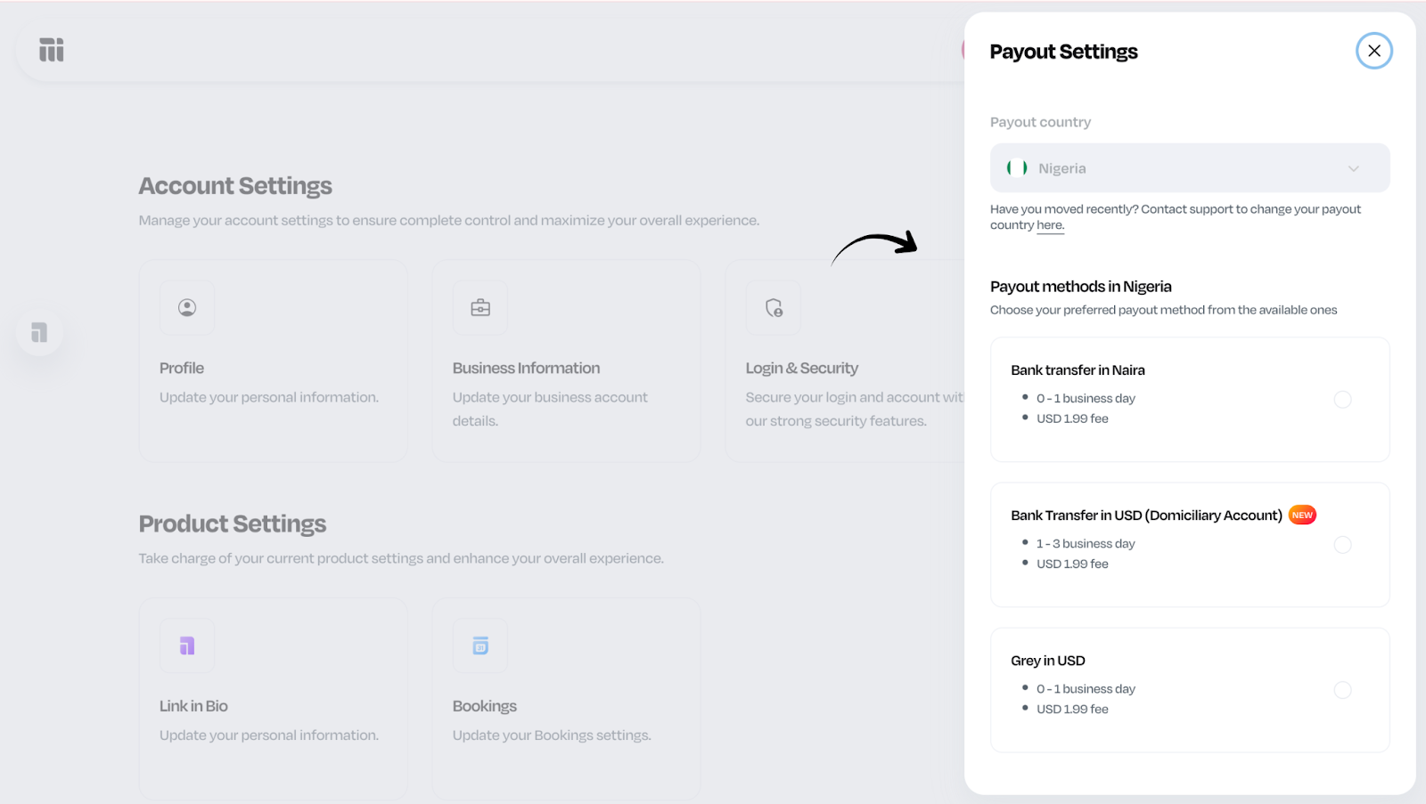 Choose your preferred payout method. You can receive your payout via your Naira account, DOM account, Grey, PayPal or Payoneer.