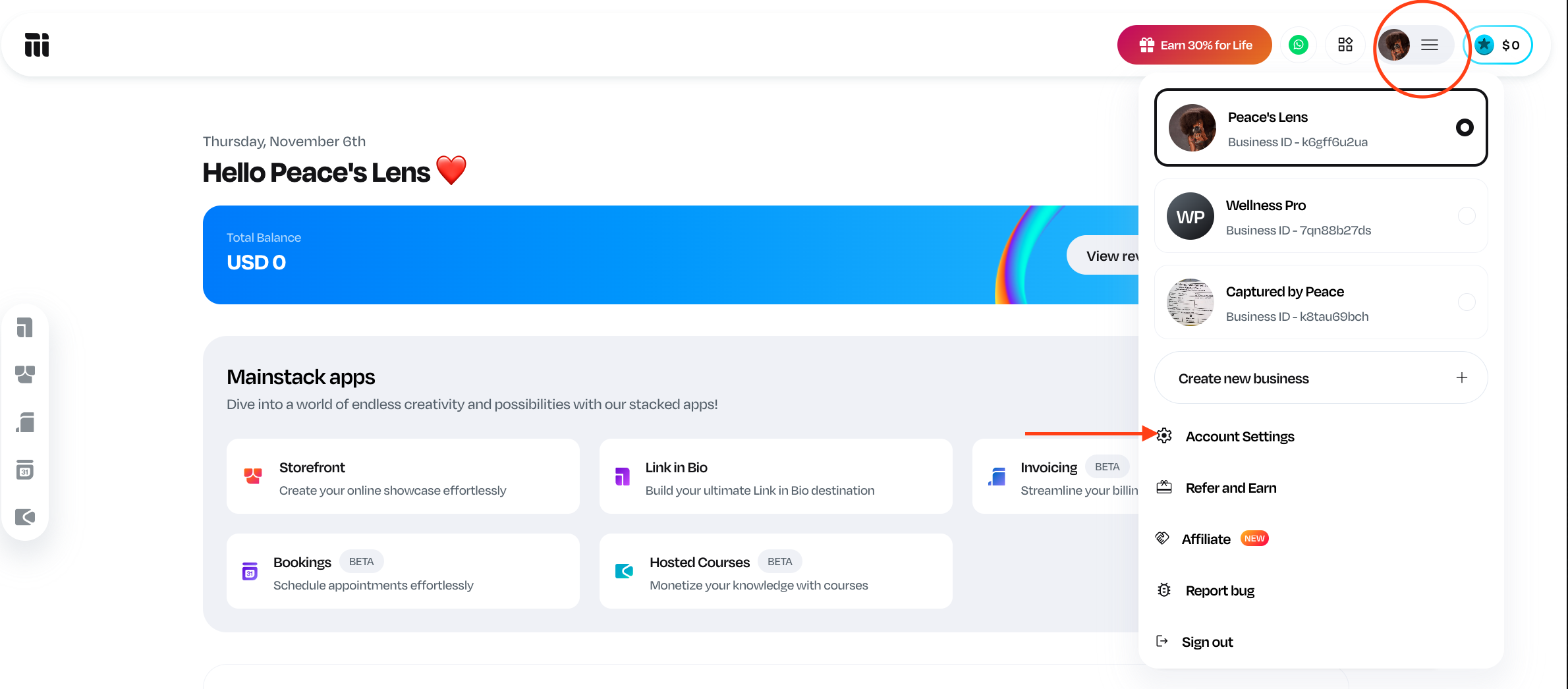 Click on the hamburger icon with your profile picture (three lines) at the top right corner of your dashboard.