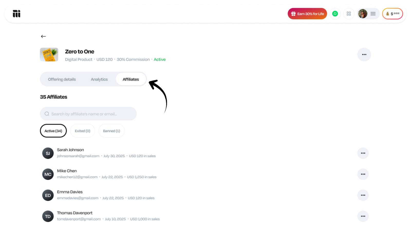 Log in to your account. Click on your profile picture at the top right of your dashboard. Click on Affiliate, and you will be redirected to the affiliate dashboard. Click on the Merchant tab Click on the three dots beside the offering you want to ...