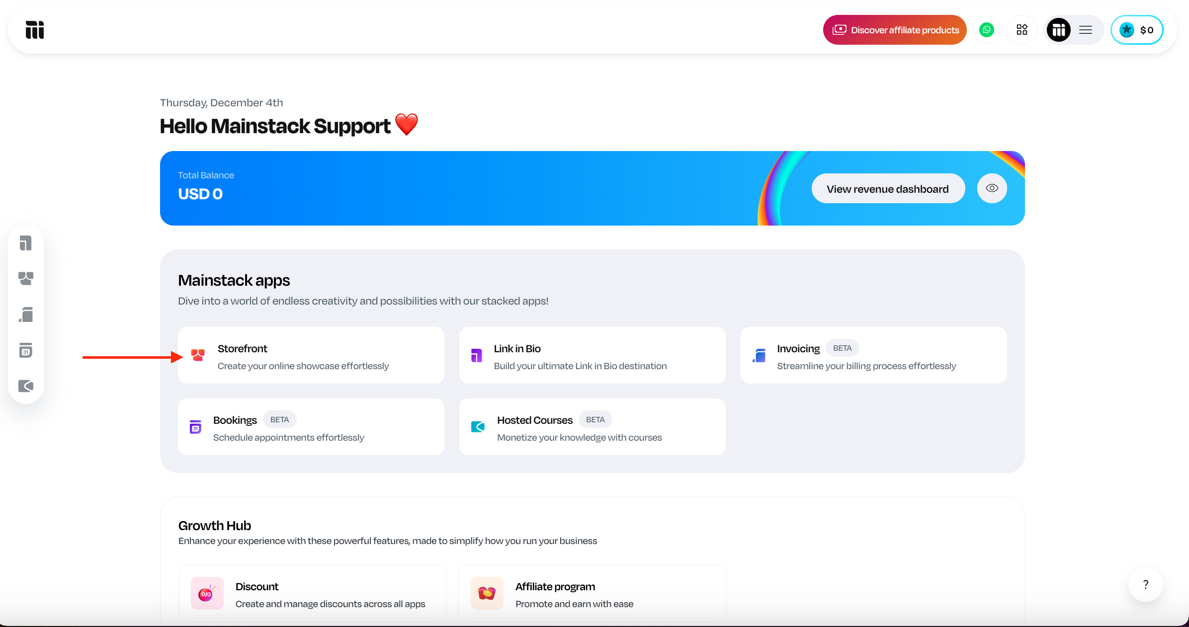 On the Home page, scroll to the Mainstack Apps section and click on Storefront.