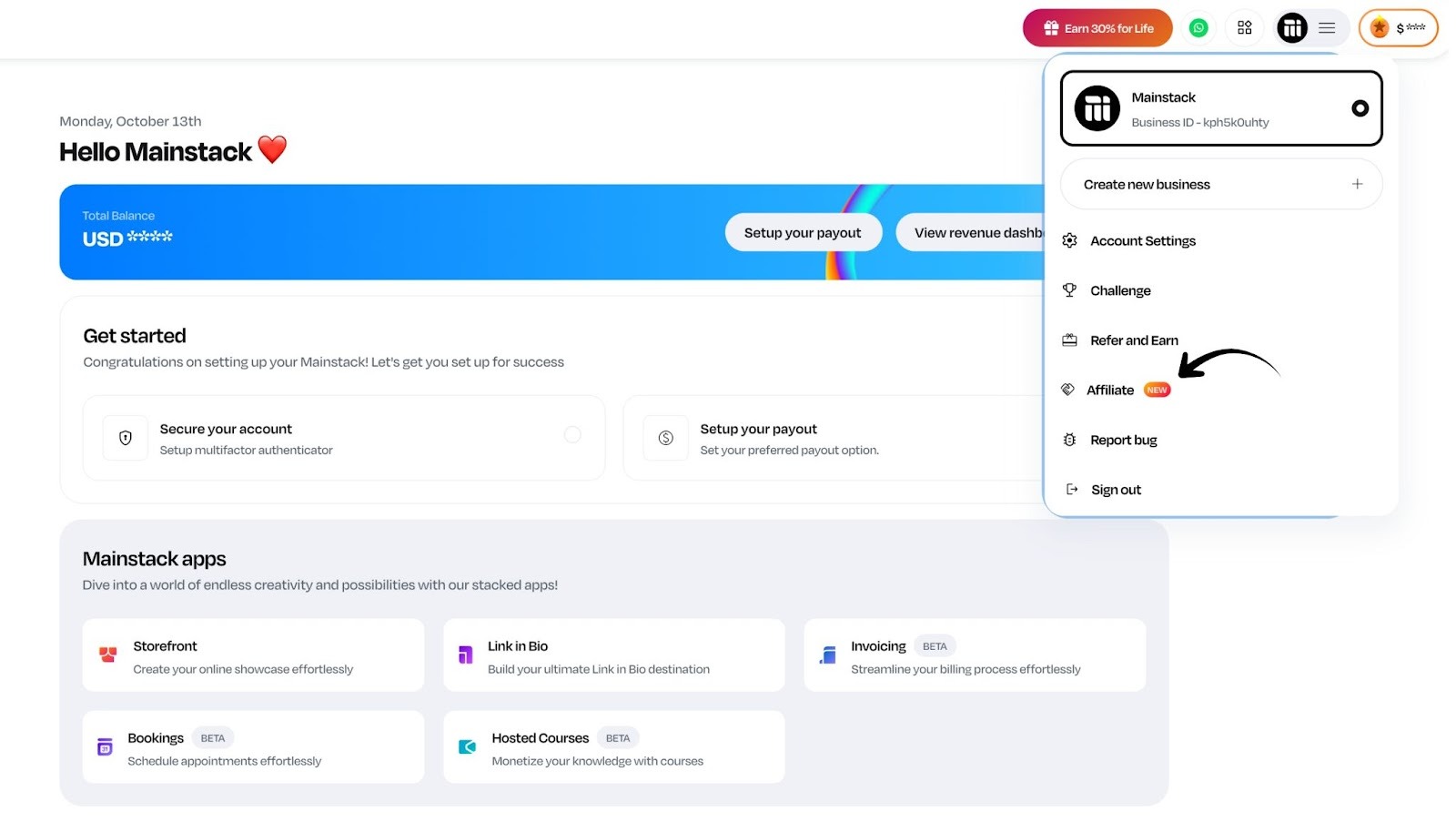 Click on Affiliate, and you will be redirected to the affiliate dashboard.