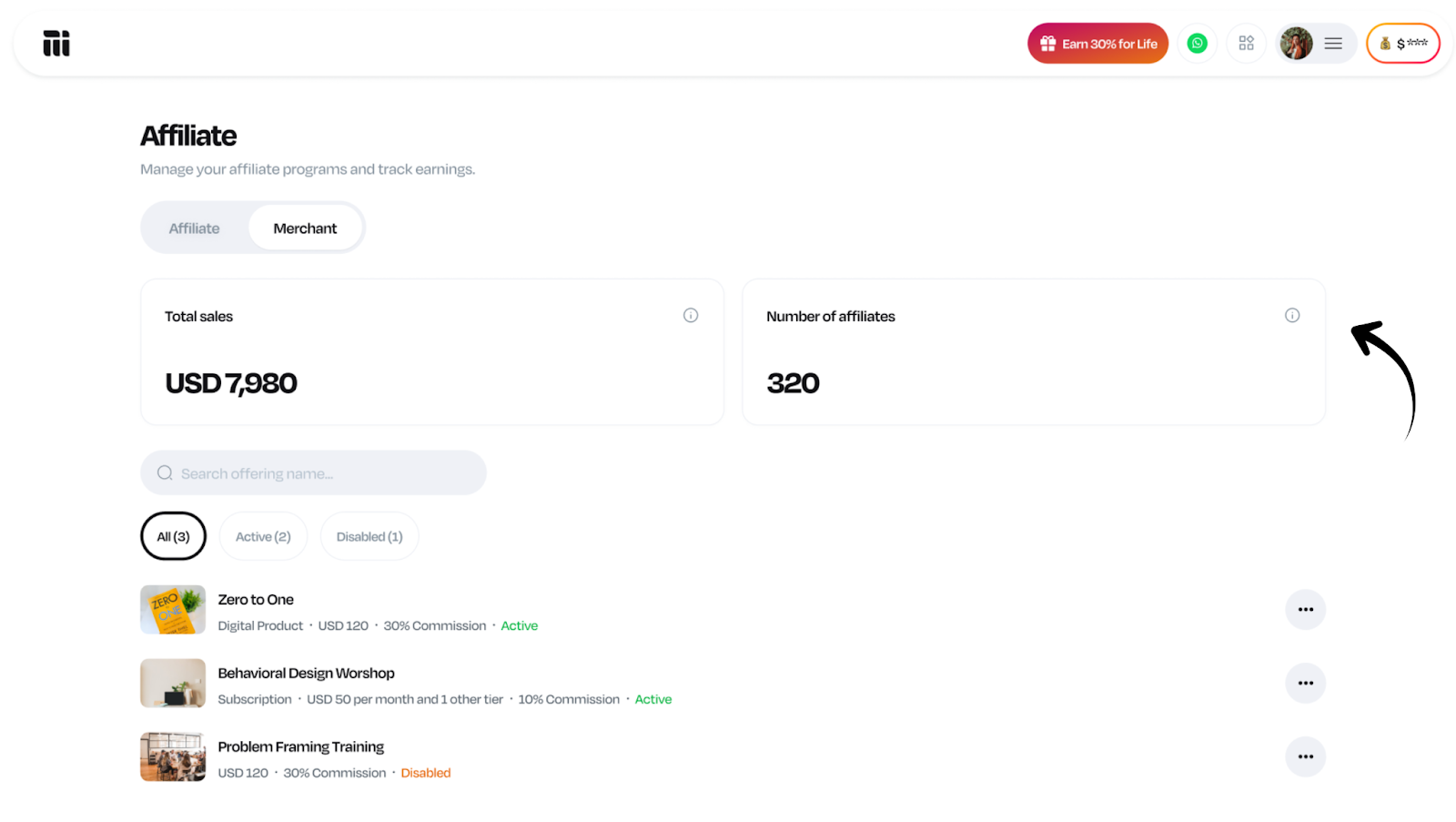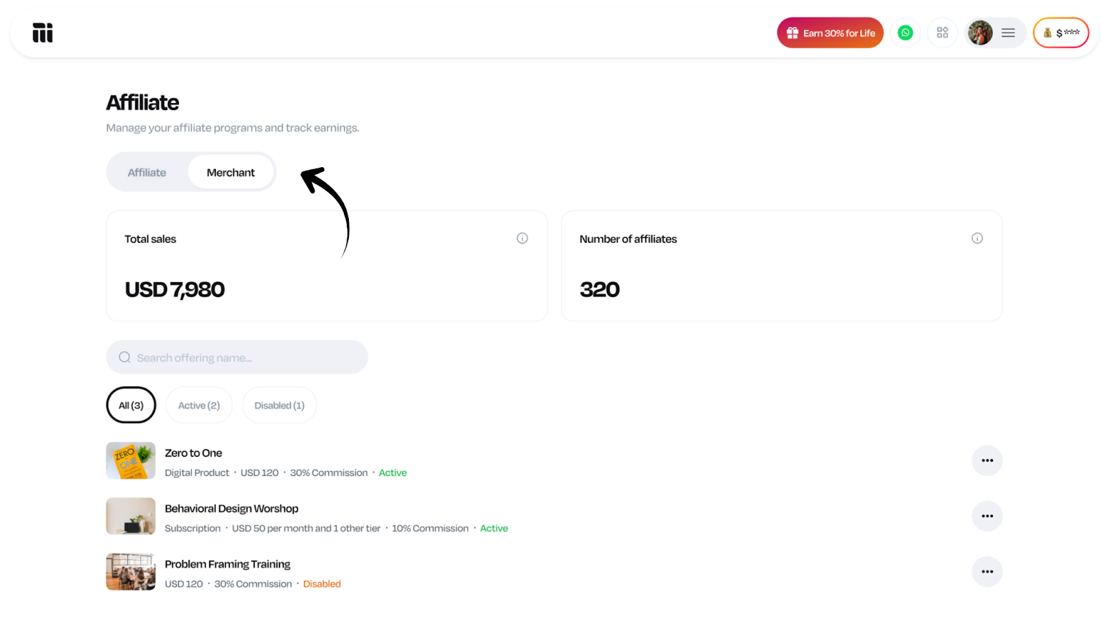 Log in to your account. Click on your profile picture at the top right of your dashboard. Click on Affiliate, and you will be redirected to the affiliate dashboard. Click on the Merchant tab Click on the three dots beside the offering you want to ...