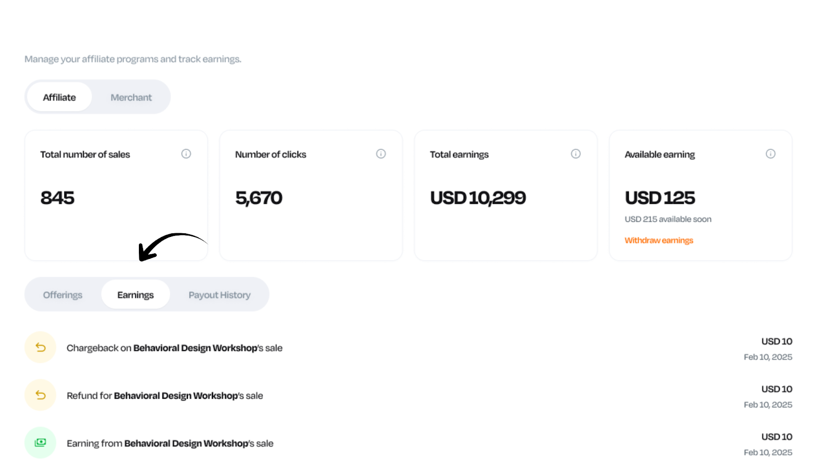 Log in to your account. Click on your profile picture at the top right of your dashboard. Click on Affiliate, and you will be redirected to the affiliate dashboard. On the Offerings page, you can track all you need to know about your offerings, ...