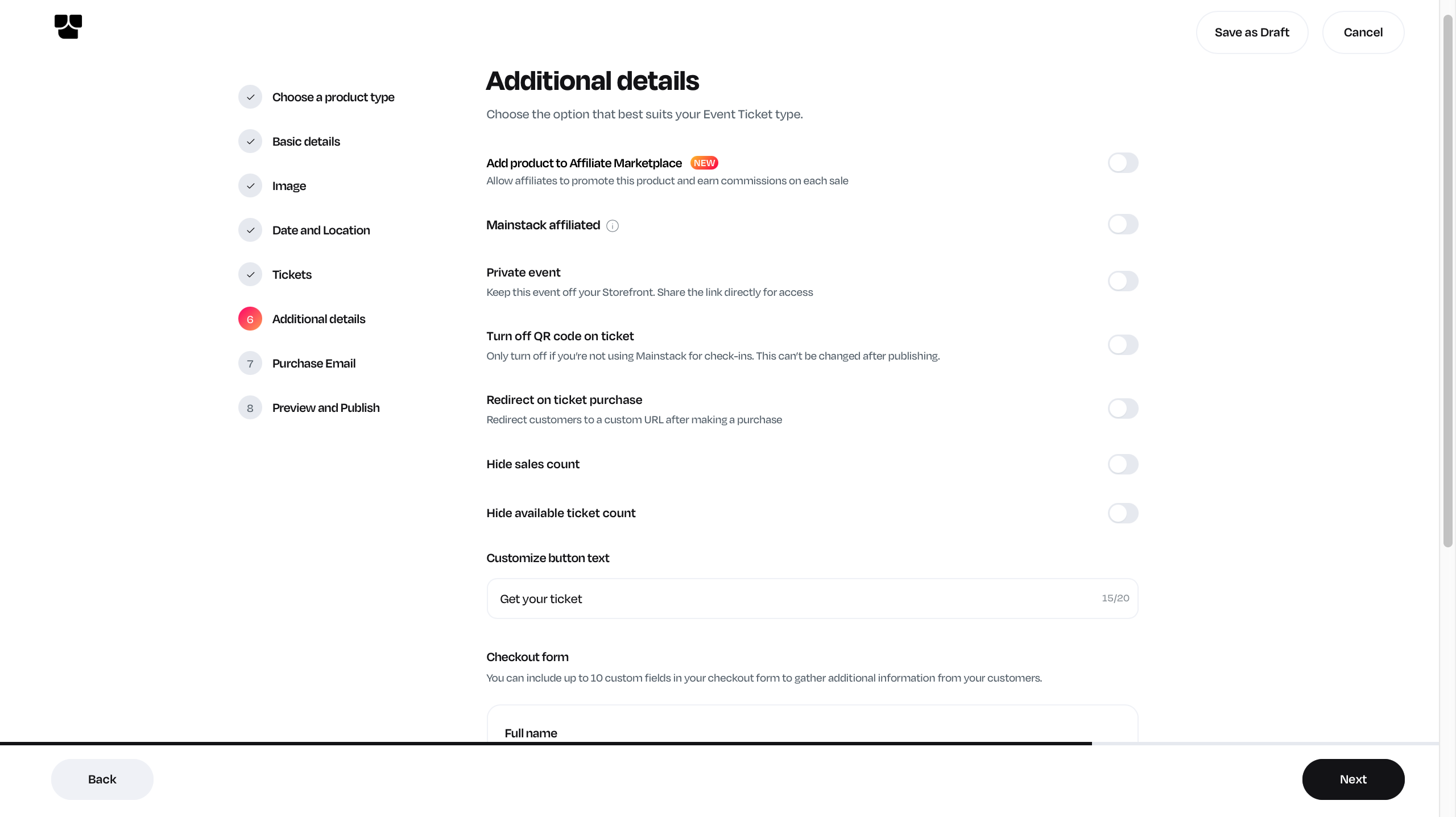 On this page, you can collect additional information on the checkout form, hide your sales count or number of available tickets, customize your purchase confirmation email, and so much more.